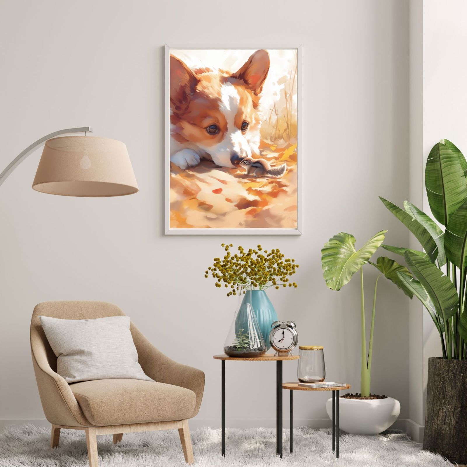 栗鼠犬戯舞 - ウェルシュコーギー犬の子犬 No.1 リス 紅葉 秋 子犬 ペットロス うちの子記念日 アートポスター 犬の絵 犬のイラスト ECOMMERCETOPSECRET_COM
